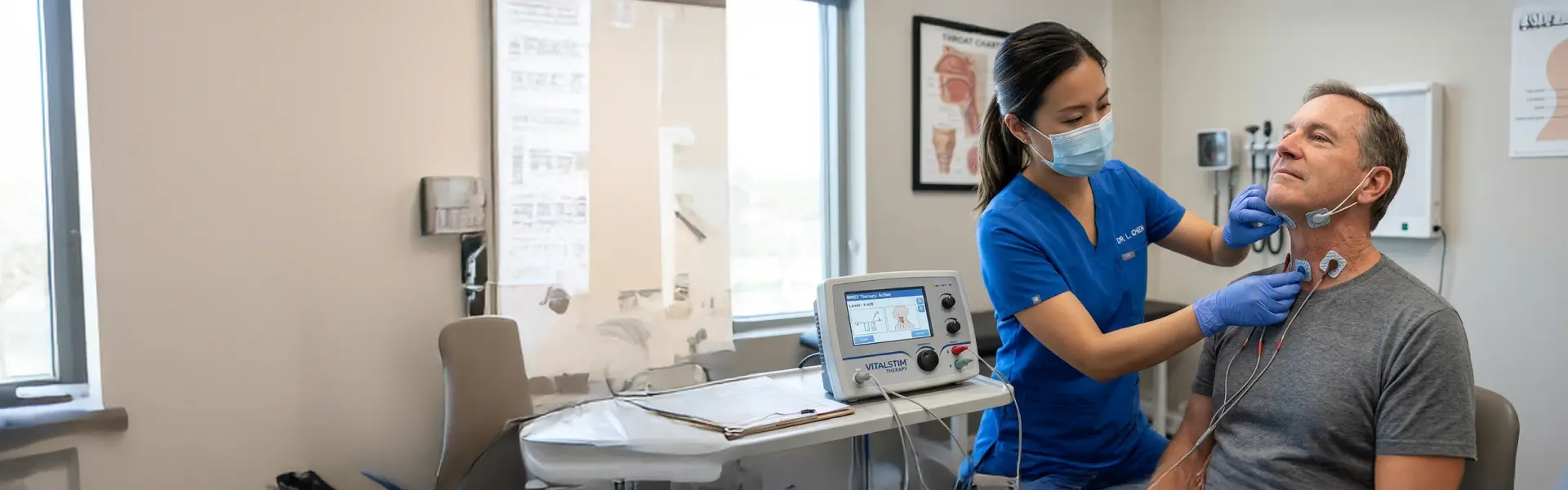 VitalStim Plus therapy is a specialised rehabilitation treatment designed to support individuals with swallowing difficulties, also known as dysphagia. It uses controlled electrical stimulation to activate the muscles involved in swallowing.